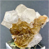 Prachtige witgekleurde fluorietkristallen gelegen op een bed van goudkleurig calciet. Een bijzondere samensmelting van twee interessante mineralen.
